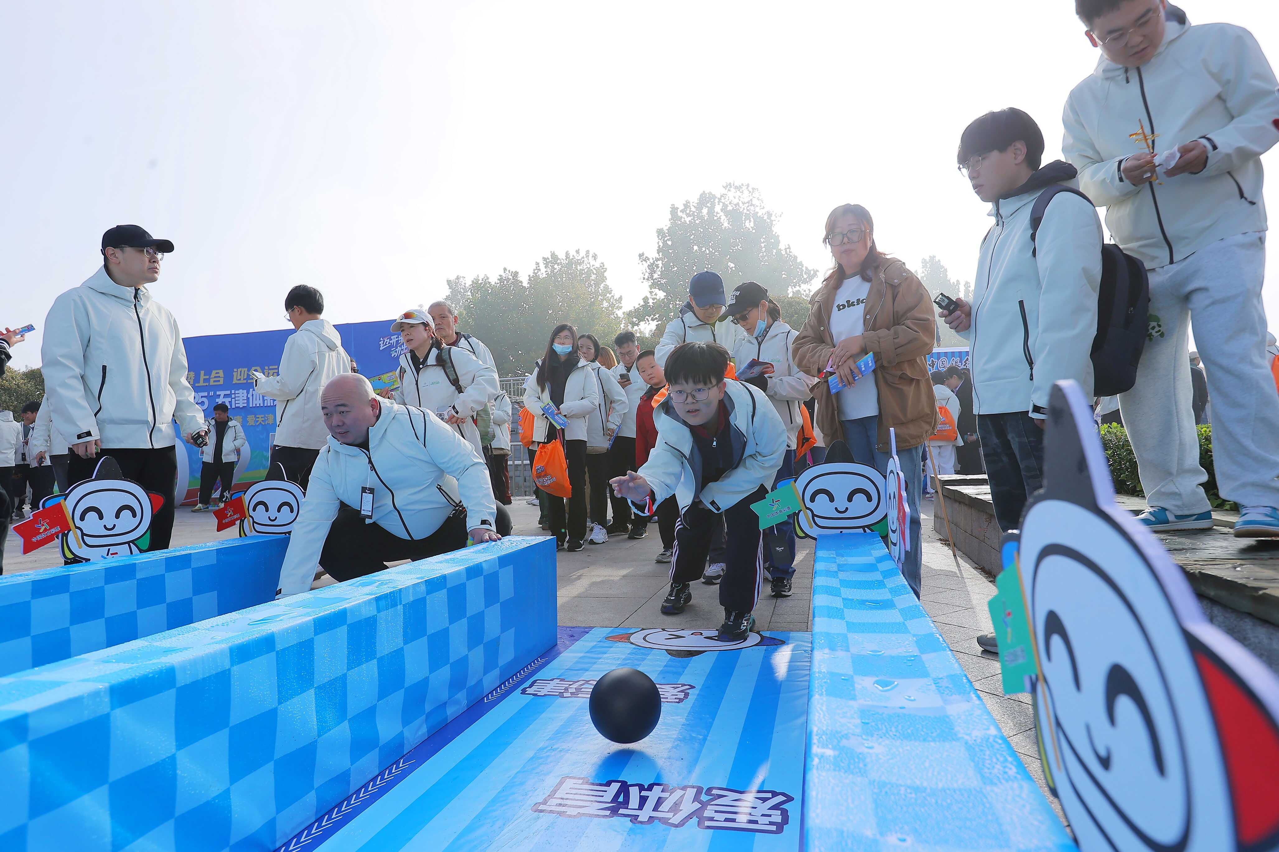 活动现场设置的特色市集与互动体验区,为参与者提供了集休闲、娱乐、健身于一体的多元化体验。特色市集将传统美食、文创展示、公益宣传与现代体育元素创新融合,让人仿佛置身于一场跨越时空的文化盛宴;互动游戏区则精心布置了保龄球、四驱单车、冰壶游戏等项目,参与者每完成一项挑战即可集得一枚特色印章,集齐后便能到特色市集指定摊位兑换天津特色美食和文创产品,极大地激发了大家的参与热情。